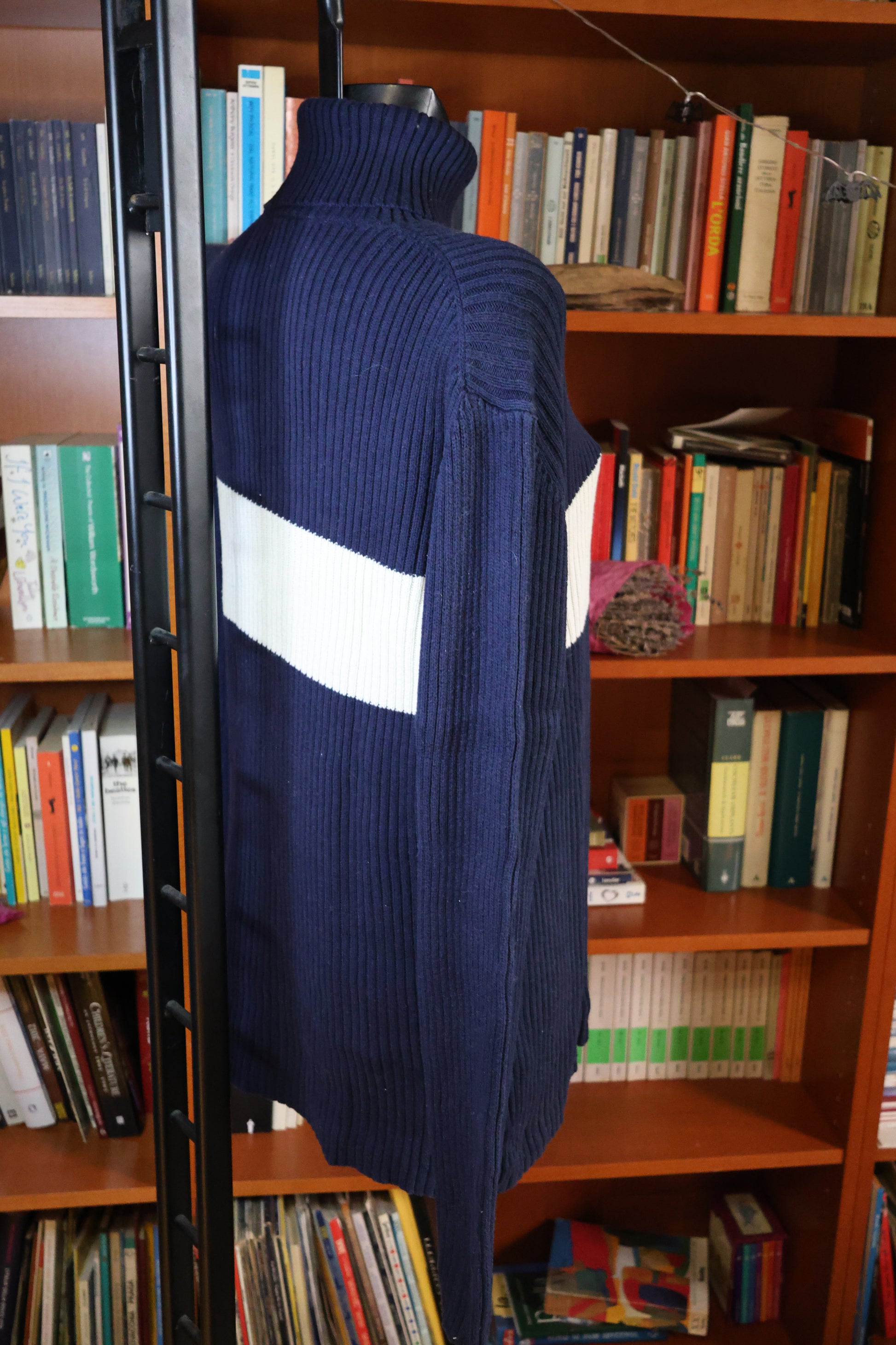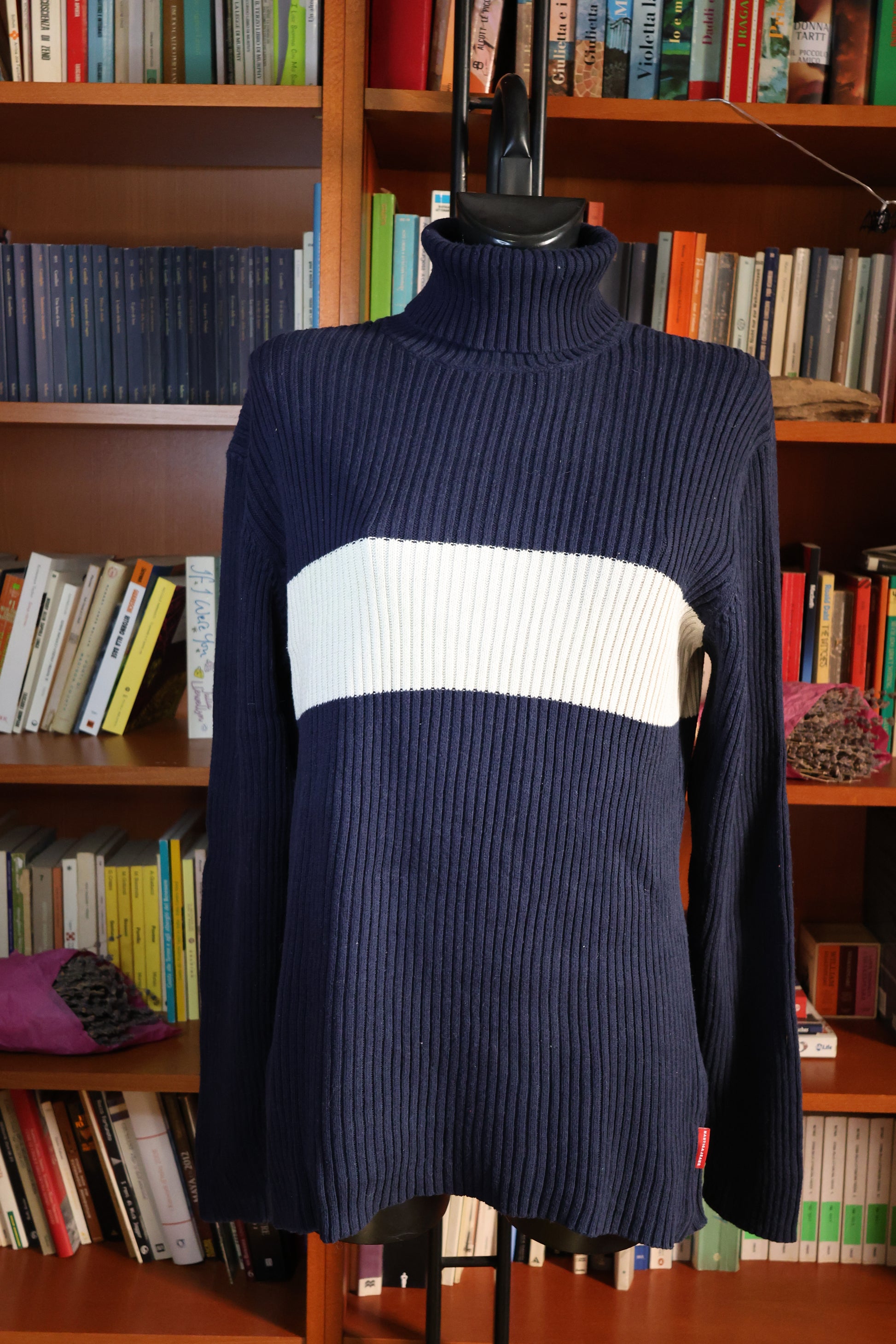 This elegant blue and white turtleneck sweater offers a timeless addition to any wardrobe. Designed to be gender-neutral, it’s a unique, one-of-a-kind piece available in size L. Ideal for assembling sophisticated and thoughtfully styled outfits.
